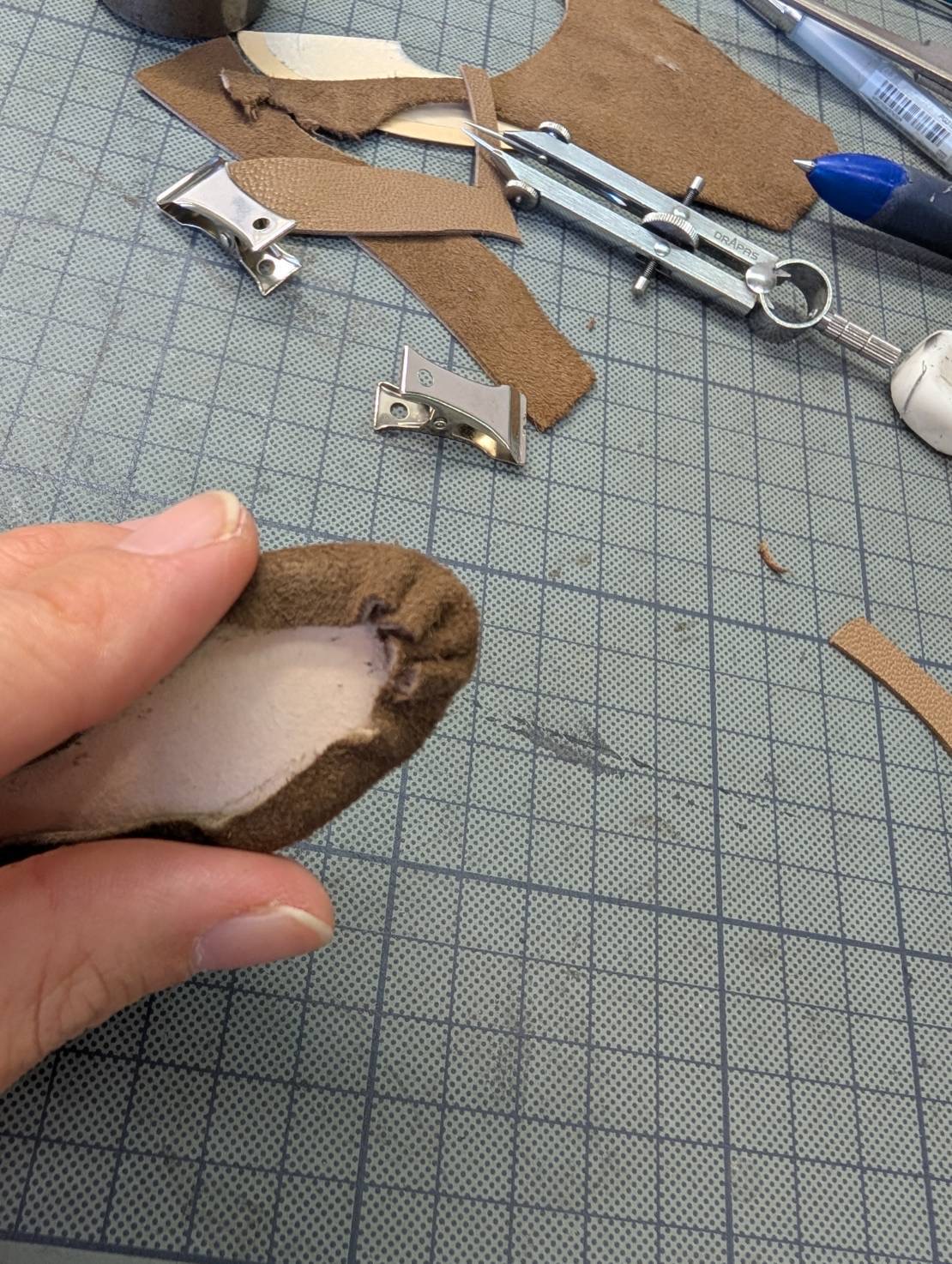 使用する革は、moumouneと同じイタリアンゴートシルキーの残革を使用し、ゴムや革ひもも、実際の靴と同じ素材で作成しています。